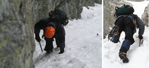 2. Přes několik plošinek v ostří ukloněného žebra (občas skoby) pod strmý výšvih s charakteristickým odštěpem v horní části (skoba). Pod výšvihem doprava pod mokrý žlábek (vpravo skoba). 3