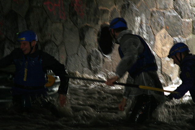 Botič. Potopená posádka kanoe pod mostem ve Vršovicích.