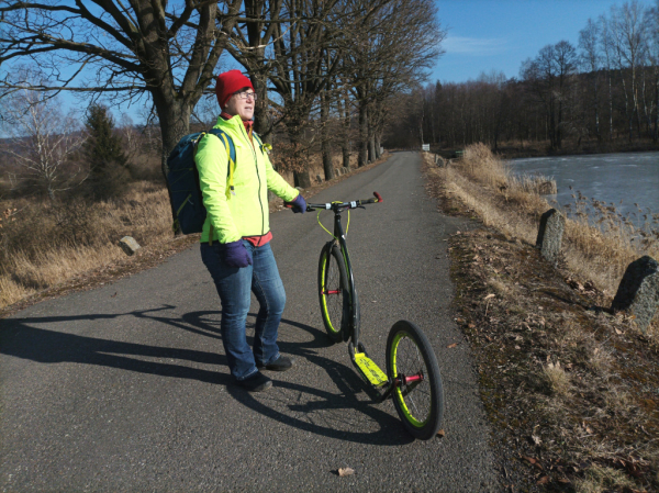 Hořejší Padrťský rybník. Bruslař přijel na kole.