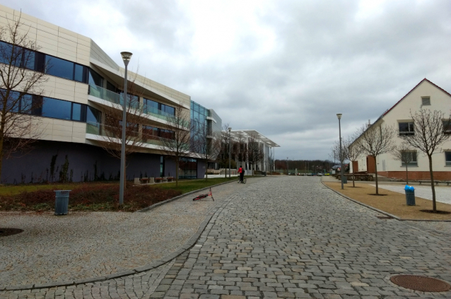 Dolní Břežany. Moderní laserové centrum a stará zemědělská budova, dnes umělecká škola.