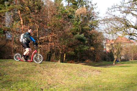 První dojmy z ježdění na zvláštní koloběžce Kostla RE-HA Maxi jsou smíšené. Zdravý jezdec si na ni asi jen tak nezvykne, ale člověk s bolavými zády ji určitě rád vyzkouší.