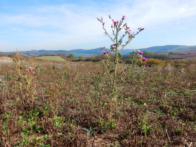 Oppidum Stradonice porůstají bodláky.