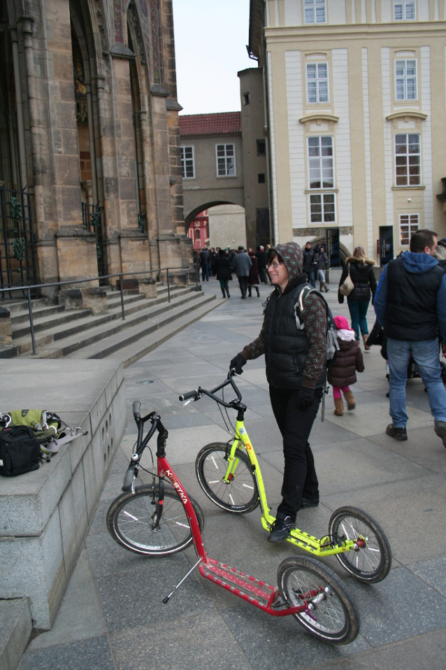 Koloběžky na Pražském hradě před vchodem do Svatovítské katedrály.