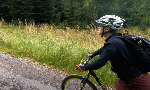 Nejprve šlapeme po rovné silnici po cyklotrase 8257 pořád nahoru do sedla U Křížku. Do hovoru jsme tak zabráni, že ho dokonce o pár set metrů přejedeme.