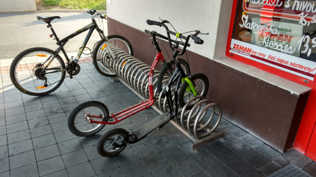 Stojan u Penny marketu na Švehlově ulici: malá koloběžka Yedoo City, větší koloběžka Kostka Hill a vzadu horské kolo GT.