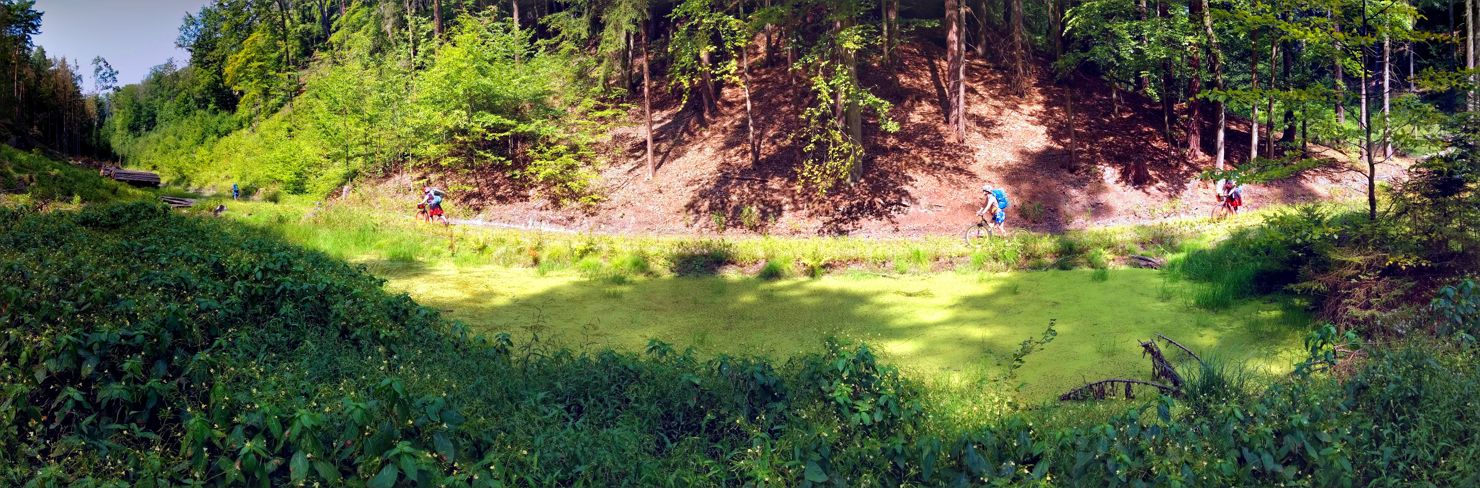 Přestoupíme na modrou značku a vnoříme se do lesa po lesní svážnici. Zajímavá jízda, kdy musíme být velmi pozorní na každou louži i každý vyčnívající kámen, nás protáhne lesem a poté loukou na silnici do Střezivojic. Hospoda Bouda s tábořištěm a koupací rybníčkem už vstala a podává se dopolední pivo. Koupání i pití si tentokrát odpustíme.