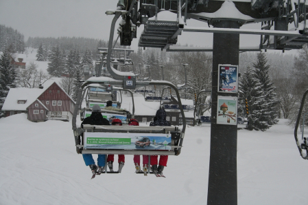Sjezdové lyžování v Oberwiesenthal. Platí sem vícedenní permanentka z Klínovce.