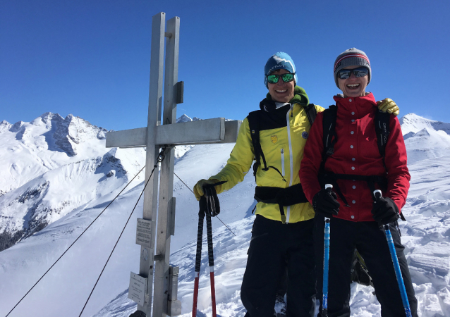 Vennspitze. Horský vůdce a jeho klientka na vrcholu.