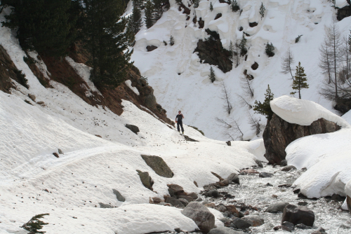 Přibližně v polovině soutěsky je nutno po velmi strmém výšvihu překonat hráz malé vodní nádrže. Někdo tudy stoupá pěšky, protože stoupací pásy už nezabírají. Když se údolí rozšíří a my vystoupáme z pásma lesa, objeví se před námi lávka přes potok (2214). Tady z hlavního údolí uhneme doleva a stoupáme bočním údolím na jihozápad. Dva široké úvaly jsou plné pevného sněhu, ale staré laviny sjeté z jižních svahů nás nabádají k větší rychlosti a zároveň opatrnosti. Těšíme se, jak se tady krásně svezeme, až se budeme vracet. Sníh odpoledne jistě změkne a my si to užijeme.