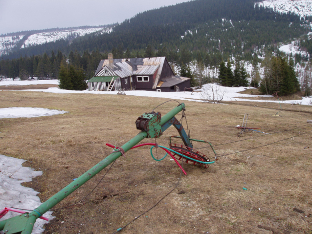 Krkonoše, nad Jánskými Lázněmi. Sjezdařská sezóna skončila.