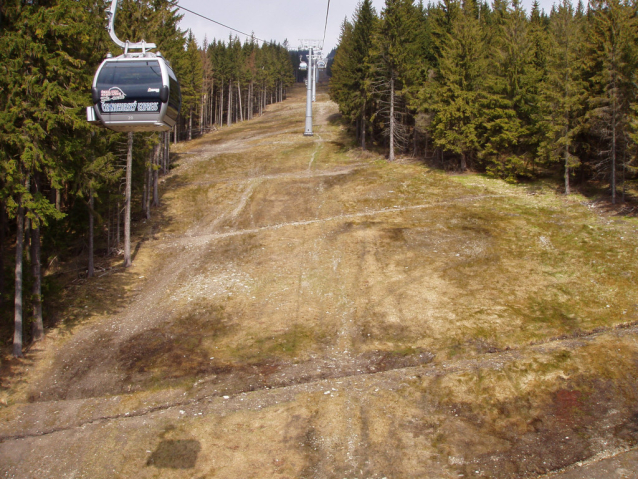 Krkonoše, lanovka na Černou hory koncem zimy.