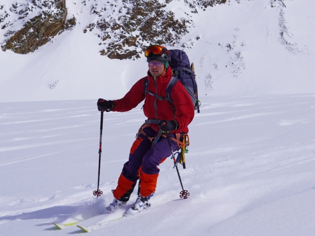 Erik sjíždí po ledovci ze sedla Hauslabjoch, ze kterého se dá odbočit na Finailspitze. Směr Hochjoch Hospitz.