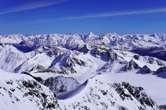 Východní Alpy. Panorama z vrcholu Wildspitze.