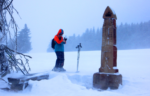 Rychle tedy nalepíme stoupací pásy na skialpové lyže u rozcestníku poblíž hraničního přechodu (1050 m) a vyrazíme po hraniční zelené turistické značce na jih do mírného kopce. Stoupáme úvozovou cestou, která je prošlapaná od pěších turistů. Na běžkách by to šlo špatně, ale na skialpech jdeme jako na procházku.