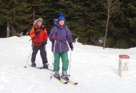 Míjíme horní stanici vleku. Po nějaké sobě sundáme z lyží stoupací pásy a už je tento víkend nenalepíme. Několika strmými lesními sjezdy a skrze hluboké úvozy sjedeme na rozcestí Pod Lysečinskou boudou (915 m). Pokračujeme k turistickému hraničnímu přechodu Horní Albeřice / Niedamirów (850 m).