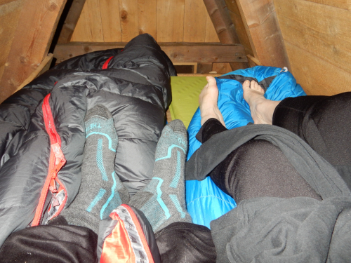 Dorazíme pak už pomalu a lehce na rozcestí Roh hranic (945 m). Stojí tady další bivakovací bouda. V patře je plošina akorát pro dva lidi, dole stůl a dvě lavice. Noc je příjemná.