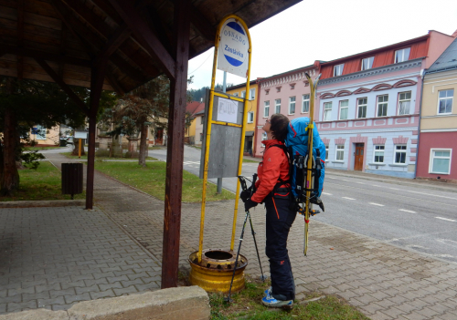 Lyže připínáme na batohy a jdeme pěšky. Další člověk, kterého tento víkend potkáváme, je zbloudilý koloběžkář na elektrické koloběžce. Další bivakovací boudu si prohlížíme na Slunečné stráni (650 m).