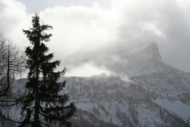 Dolomity, San Pellegrino. Horský masiv Focobon je bičován sněhovou vichřicí.