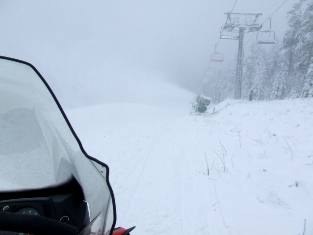 Sněžný skútr kontroluje sněhové dělo v Herlíkovicích.