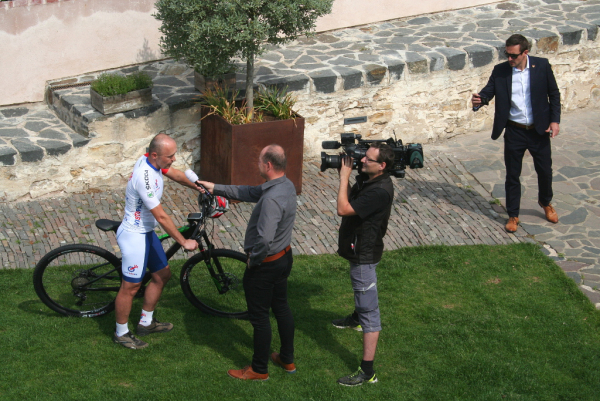Cyklista stoupá Horskou ulicí z Albertova na Karlov v Praze.