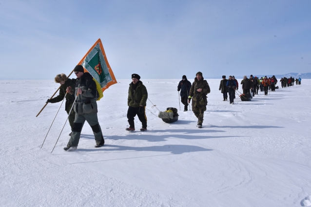 Irkutští kozáci jdou vzpomínkový pochod přes Bajkal.