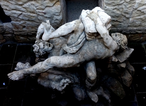 Vystoupáme na schodiště, které celému areálu dává atmosféru. Vidíme to, co bylo vyhrazené jen šlechtě – před námi Pražský hrad a v hloubce pod námi sochy Titánů svržených Diem do Tartaru. Každá socha zde odkazuje na drsnou antickou mytologii. Ostatně podle toho nakonec dostala jméno celá pražská čtvrť.