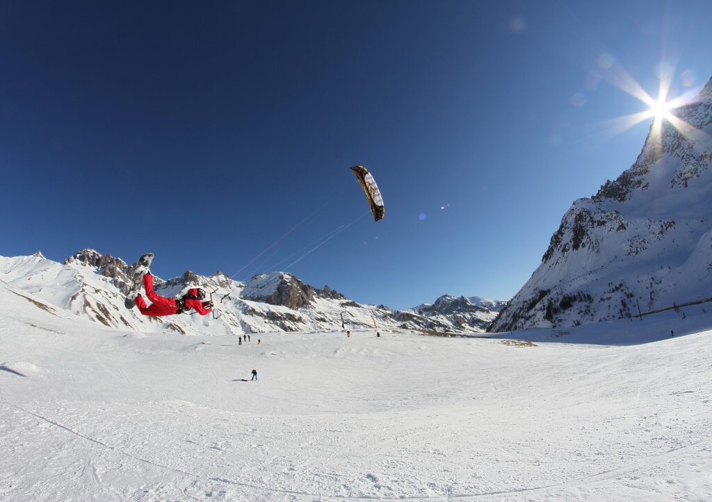 V tomto sportu se jezdci za pomoci větru a tažného draka vozí na snowboardu nebo lyžích.