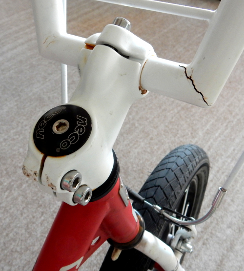 Po dvou letech se zlomil rám v nejslabším místě mezi nášlapem a rámovou trubkou. Přesně tam, kde to každý odborník očekával. Provizorně ho svařili chlapi na vesnici, ale varovali nás, že za nic neručí, protože tak slabý kov ještě nikdy nevařili. Ten rok bylo potřeba vyměnit gripy na řídítkách a všechny brzdové špalky.