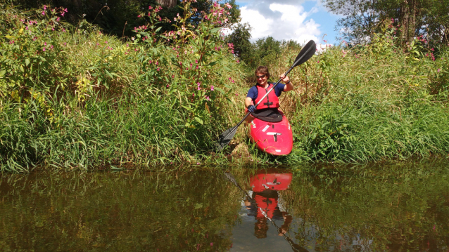 Ohře. Kuba v kajaku se sesunuje do řeky od chmelnic ve Stekníku.