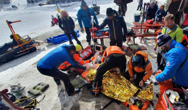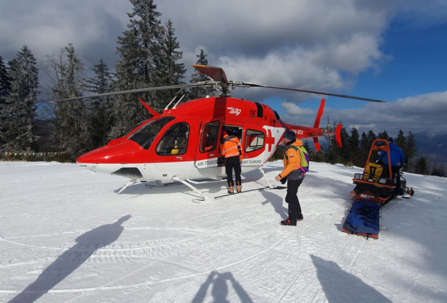 Neuspěšný pokus o záchranu zkolabovaného muže. Horská služba a zdravotníci ve vrtulníku.