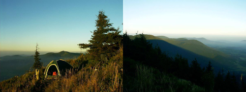 Jsem se sebou spokojen. Výstup jsem zvládl za hodinu a čtyřicet minut. V dobré náladě sestupuji kousek průsekem po severním hřbetu. Hledám místo na stan. Moc rovné plochy tady není, takže si vybírám korýtko vedle vykotlaného stromu. Moc pohodlné to tedy nebude, ale za tu expozici a výhled to stojí.