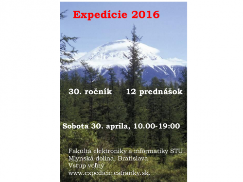 Na 30. ročník medzinárodného stretnutia expedičných turistov a netradičných cestovateľov Expedície 2016 pozývajú OZ Karpaty a Klub slovenských turistov. Dvanásť prednášateľov na širokom plátne bude prezentovať vydarené podujatia z nenarušených alebo málo narušených oblastí, ktorým sa spravidla vyhýbajú masmédiá a cestovný ruch.