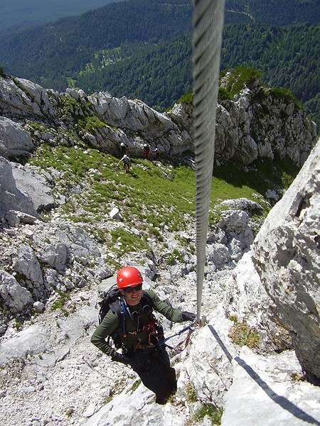Od nástupu vede feráta krátce po hřebenu (B), poté po rampě ve skalní stěně (B/C), kde narazíme na pamětní tabulku.