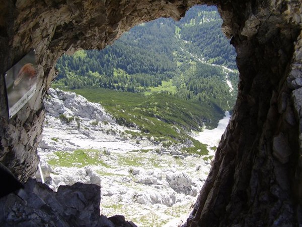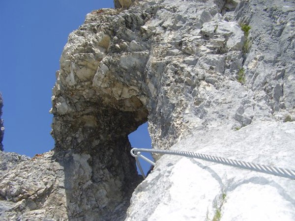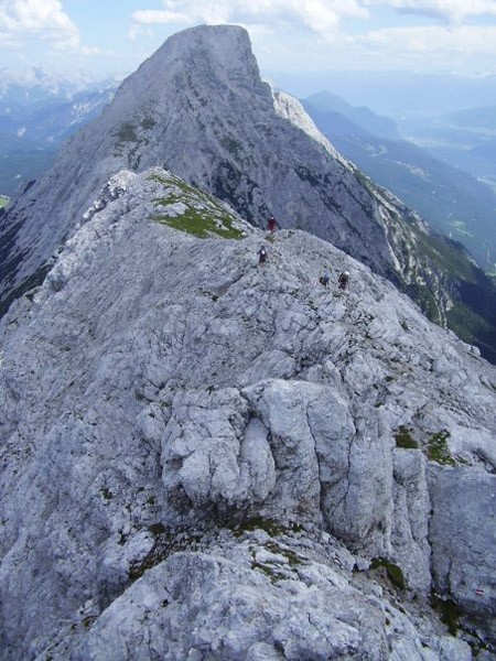 Poté jdeme až k prvnímu hřebenu C/D (Zugspitzblick, 2235). Na hřebenu se dáme západně (A až A/B) a krátce sestupíme do žlabu (A/B). Přes hladkou rampu (B/C) do lehkého traverzu (B, pak A/B). Dále jdeme až po hraně (B až C) skrz Oko orla – efektní průchozí skalní okno (B/C).