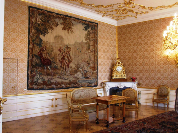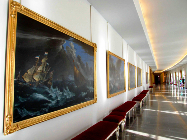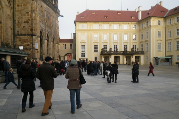 Vltava. Pražský hrad shlíží do propusti Helmovského jezu u Štvanice.