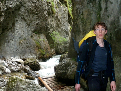 Čekáme na kládách u božích muk, až dorazí poslední turisté, a poléváme se vodou. Začíná Prosiecká dolina, jedno z nejkrásnějších míst výletu. Skalnaté údolí je celé vymodelované potokem. Trocha vody teče v nejnižších místech, ale jinak nic. Jdeme ve skalním "účku" a jen občas z něj musíme vylézt kvůli vysokému schodu. To se pak přidržujeme lan a klesáme po skále. Následuje několik různě dlouhých žebříků. Údolí se rozšiřuje a u velkého vodopádu obědváme.