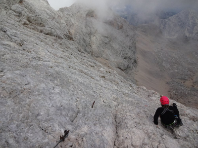 Ferátový set bych ale docela užil. Při výstupu stěnou vidím, že to jsou jiní borci než Italové v Dolomitech. Takové exponované výšvihy, které se tu zdolávají bez jakéhokoliv zajištění, by v Dolomitech měly určitě ocelové jistící lano a možná i stupy. Na regulérní ferátě používám k jištění ruce, mnohdy je potřepa lézt volně kvůli sporému jištění.