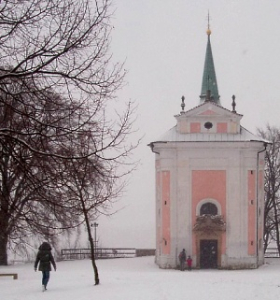 Vyrážíme v poledne do Brd. Padá sníh s deštěm. Jdeme z Řevnic od náměstí okolo Lesního divadla, stoupáme na hlavní brdský hřeben a míříme na Skalku. Naším cílem je půvabný poutní kostel a křížová cesta nad ním.
