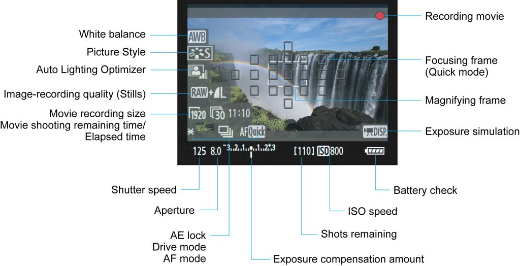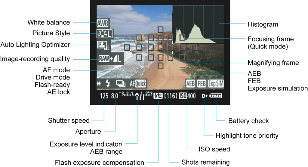 Displej LCD typu transmissive umístěný v hledáčku umožňuje výběr z mnoha překryvných zobrazení a usnadňuje kompozici snímku – lze zobrazit body AF, kruh bodového měření a kompoziční mřížku.