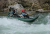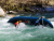 Další dvě peřeje jsou delší a výživnější. Jejich obtížnost jde hodně přes dvojku. Komár sedí v kajaku po pás ve vodě.