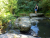 Jez u Valečkova mlýna je také také rozvalený. Zastavujeme před ním a prohlížíme si komplikovaný průjezd mezi velkými balvany, které z jezu zbyly. Za nízkého stavu vody je to hlavolam vyžadující přesné záběry pádlem. Bez problémů by se ovšem jez dal přenést vpravo po louce.