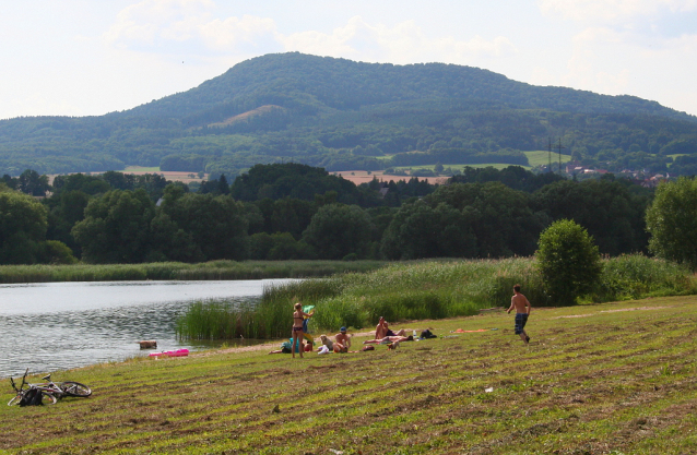 Rybník Chmelař Úštěk. Nad jezerem majestátně dohlíží hora Sedlo.